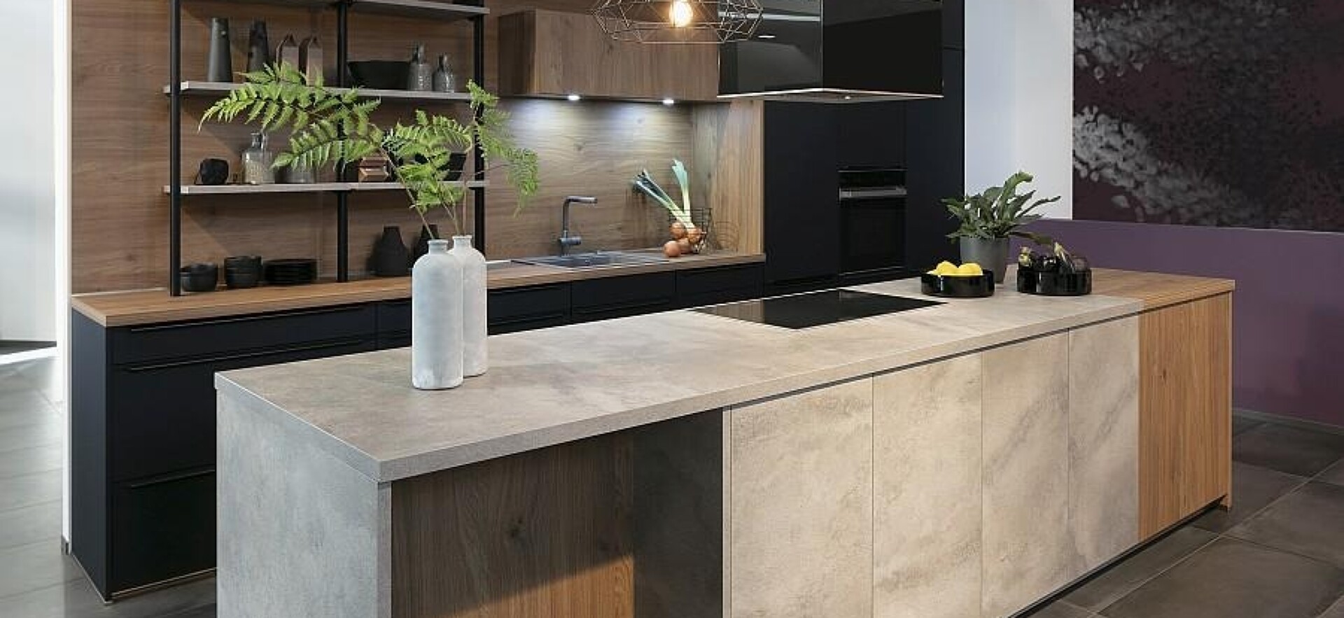 Sichtbeton ist voll im Trend – auch als Oberfläche in der Küche. Beispielsweise als Arbeitsplatte: Beton ist kratzfest, wasserfest, hitzebeständig und pflegeleicht. Durch die poröse Oberfläche ist er aber auch anfällig für Flecken, deshalb sollte man darauf achten, dass er versiegelt wurde.